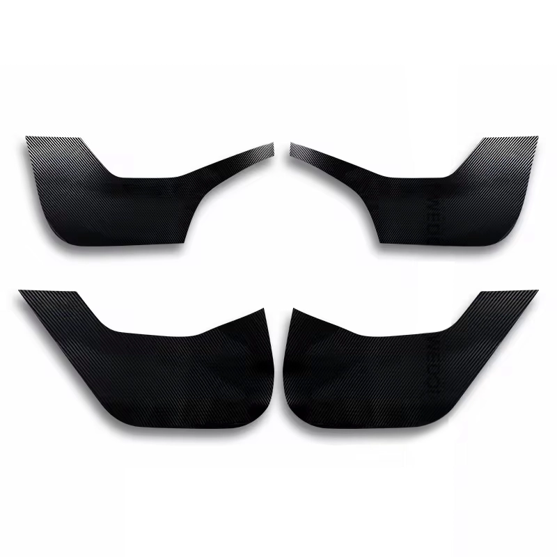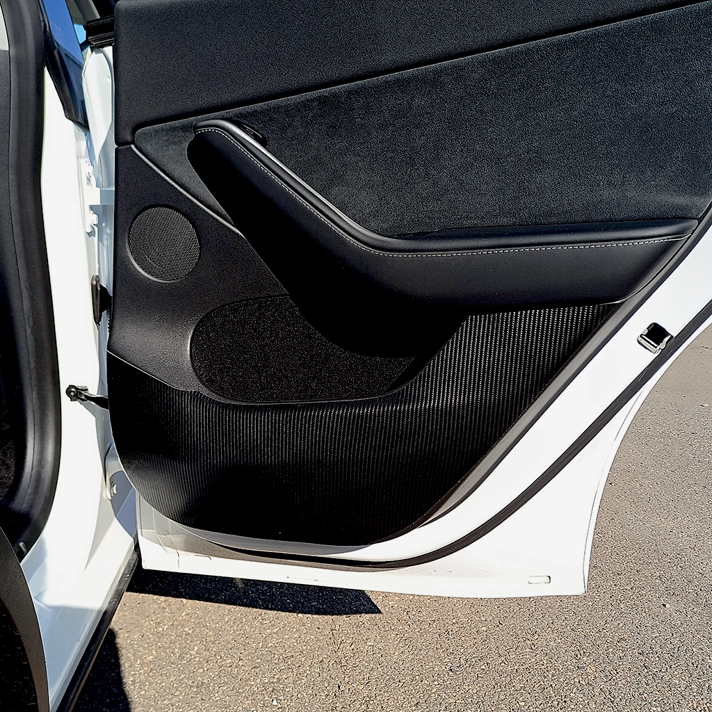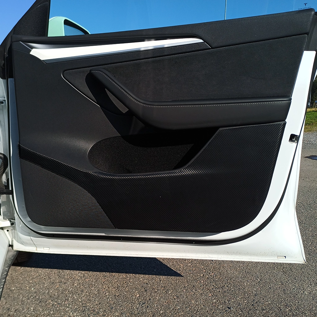 Dørsparkplader til Tesla Model Y. De sorte, tykke og bløde mærkater har et kulfibermønster. De passer perfekt på den nederste del af indersiden af Tesla Model Y-dørene. Mærkaterne beskytter indersiden af dørene mod ridser og tager din bils sportslighed til det næste niveau!
