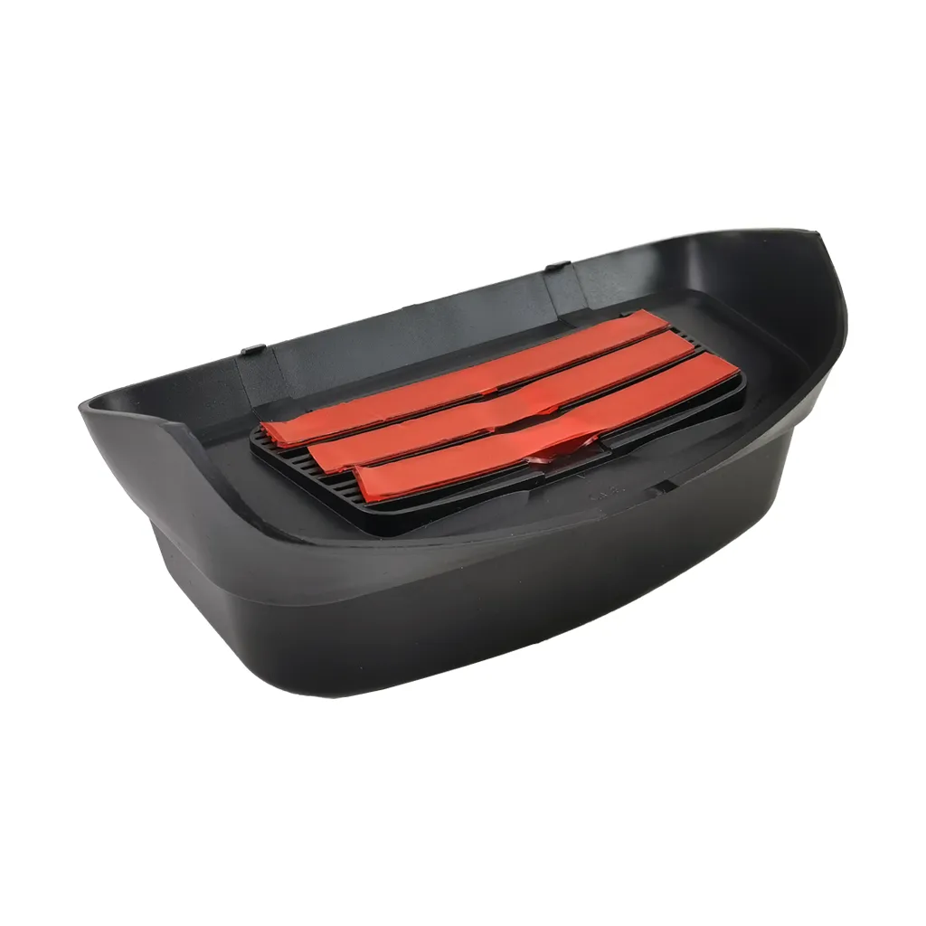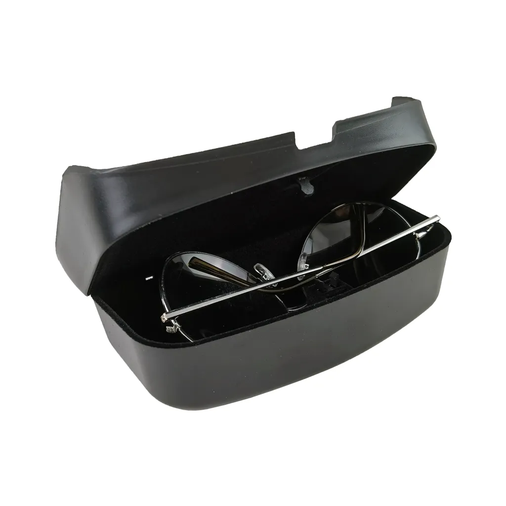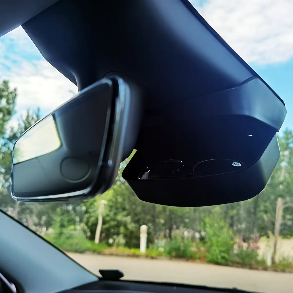 Roof glass enclosure - Tesla Model Y. Stylish black glass enclosure that opens with a gentle push. Mounts on the front of the windshield mirror, allowing you to make the most of every space in your car. Size-wise, normal glasses will fit just fine. The pilot glasses used in the picture are large in lens area.